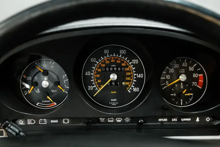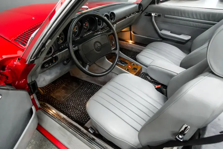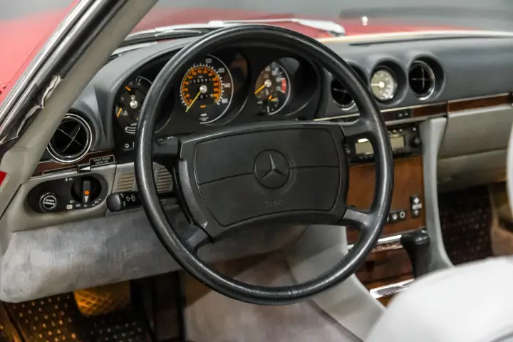 ONE would be hard pressed to find a cleaner, more crisp, sharp 107 SL than this example ! The car comes with its original window sticker, books ,manuals ,service tickets ,and tools. The car comes with both Hard top and soft top(soft top is as new).The soft top compartment still looks new. The paint is as perfect as I have witnessed in recent years. The tires are deep in tread, all bright work is crisp and clean without flaw. The gray leather seats still look new ,
